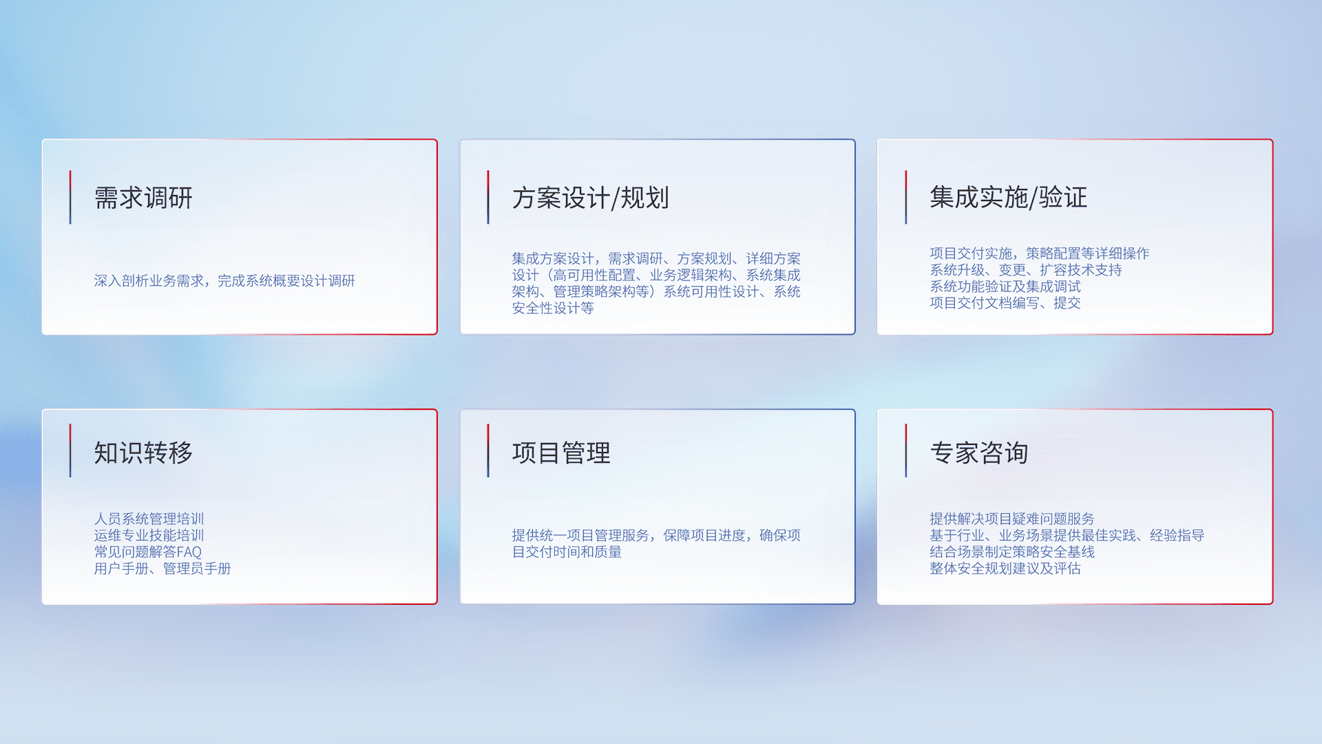 针对客户行业特性,,将宏观的安全战略和需求,,,通过专业的交付服务,,实现项目落地,,,,为客户提供标准规范的集成交付服务。。。。